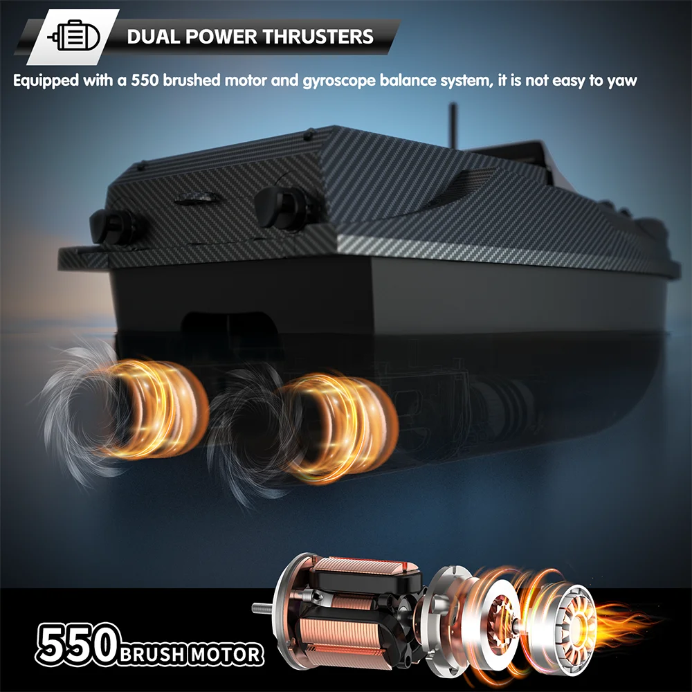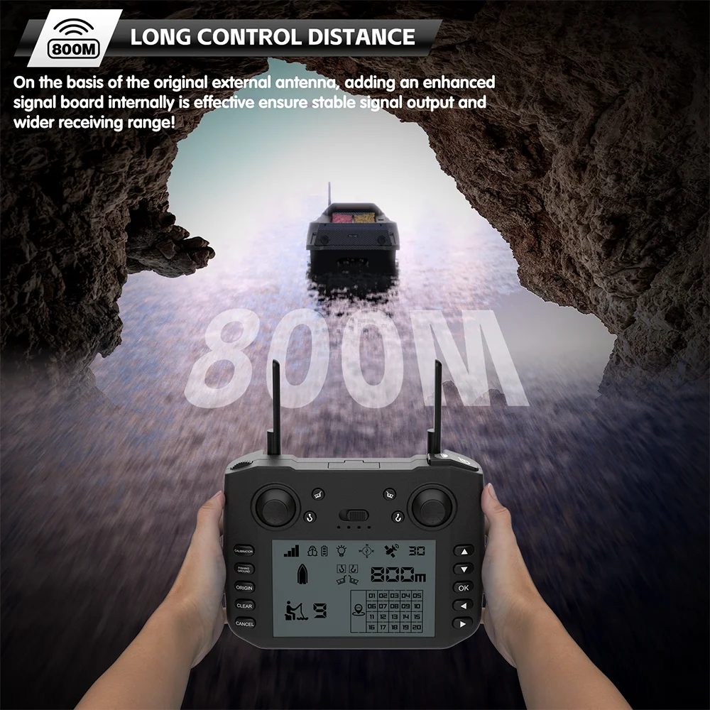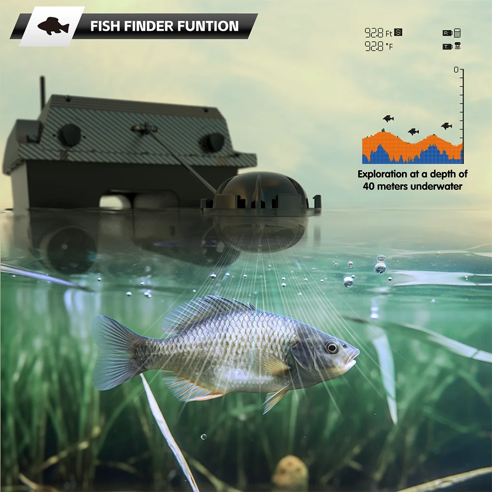 Fishfinder Version: Bait boat (including 12V 20A battery) * 1, Boat battery charger * 1, Remote control * 1, Remote control charging cable * 1, Eyebolt*2, Remote control pole cap*2, Hanging rope * 1, Spare propeller * 2, Antenna * 1, Backpack * 1
