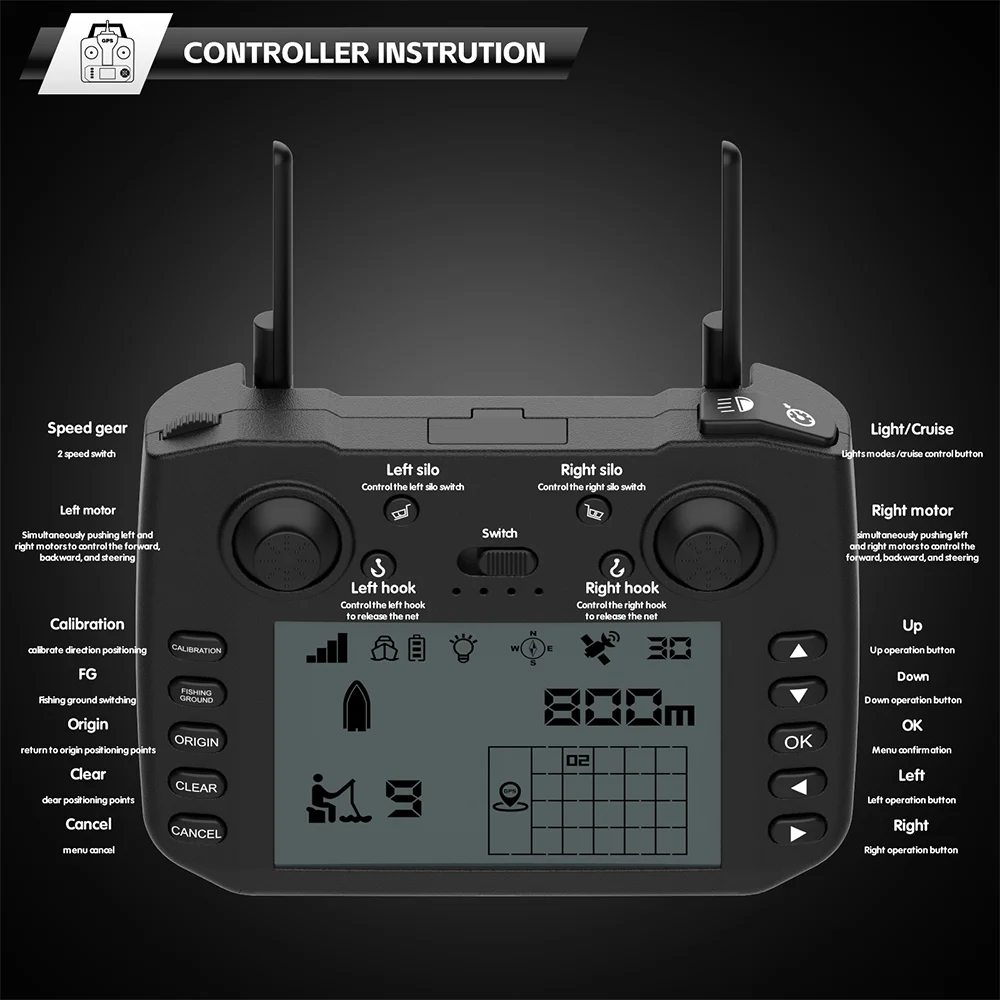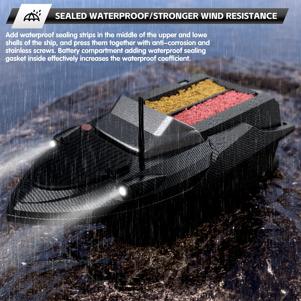 Basic Version: Bait boat (including 12V 20A battery) * 1, Boat battery charger * 1, Remote control * 1, Remote control charging cable * 1, Eyebolt*2, Remote control pole cap*2, Hanging rope * 1, Spare propeller * 2, Antenna * 1, Backpack * 1