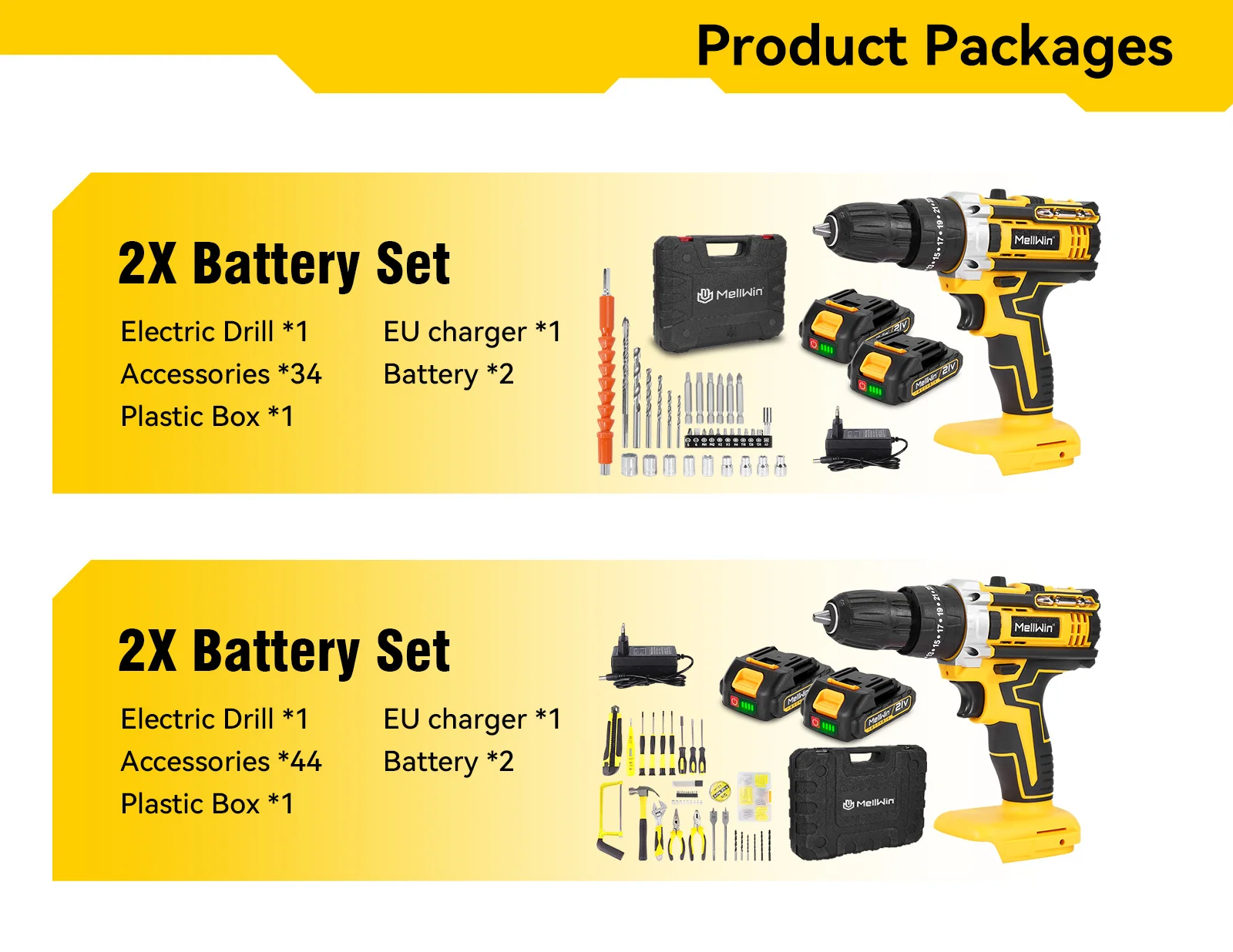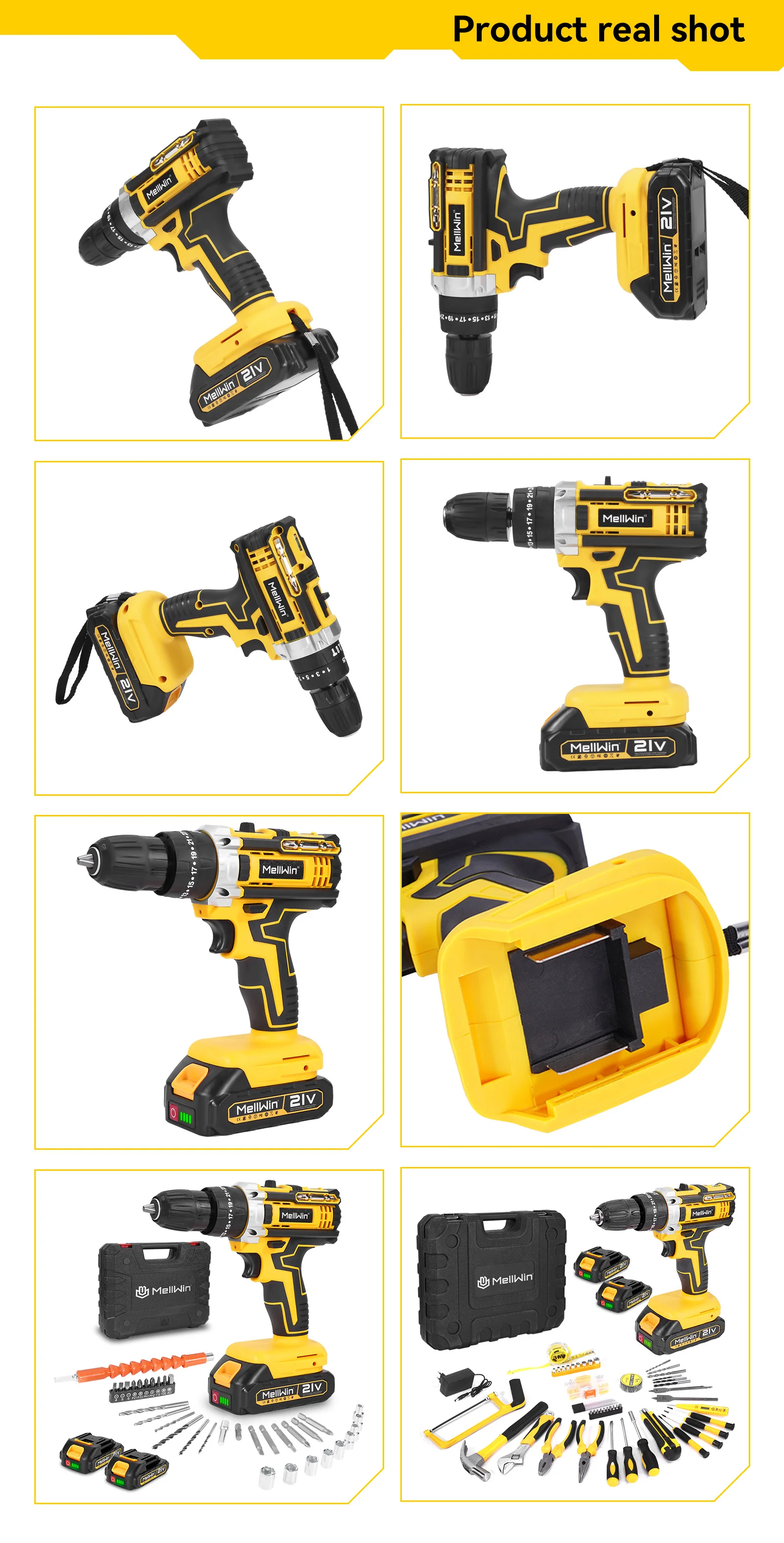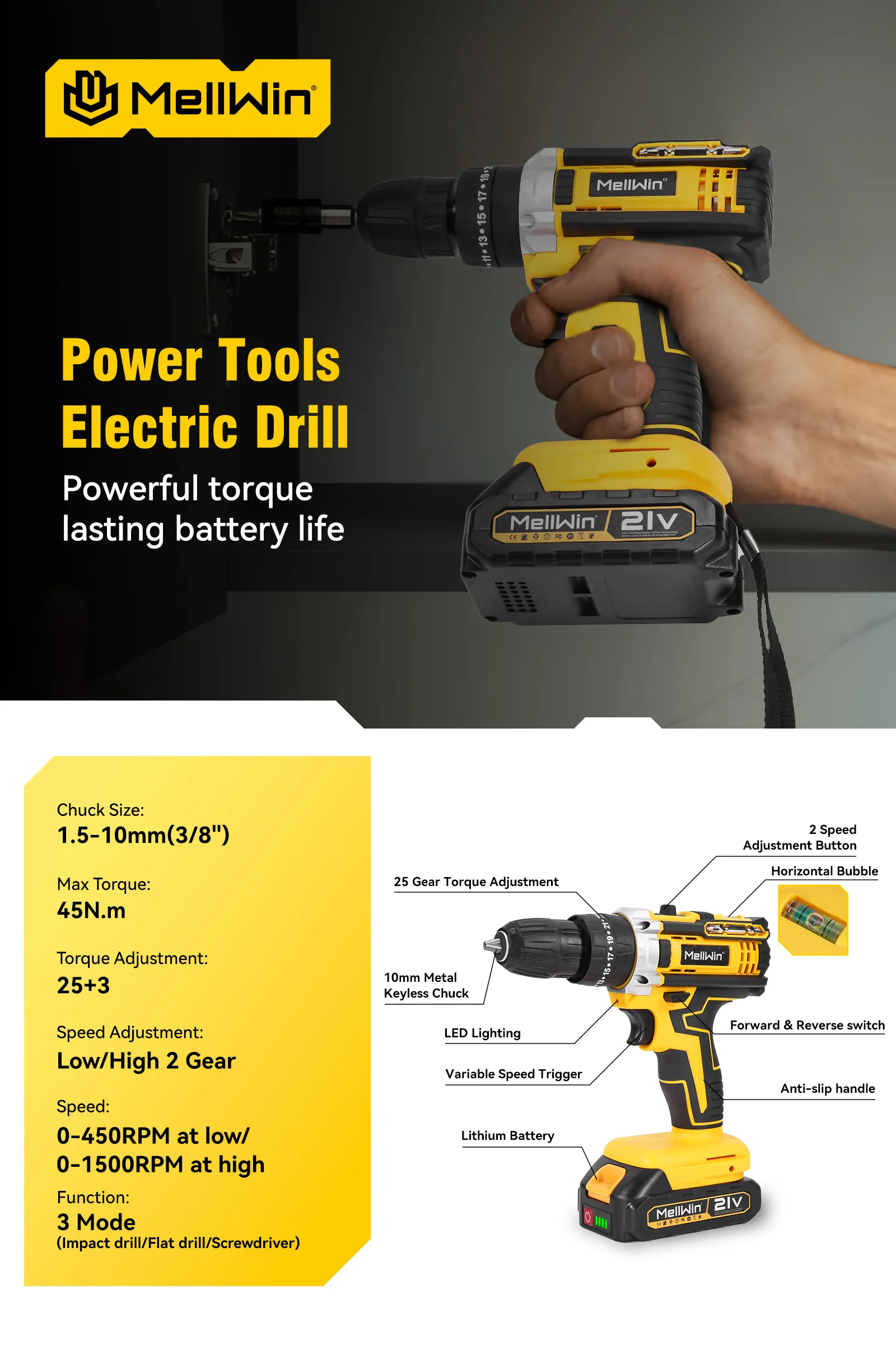 MELLWIN 10MM 25+3 Torque Electric Impact Drill 2 Gear Speed Adjustable Cordless Electric Screwdriver Power Tool For 21V-18V Battery
