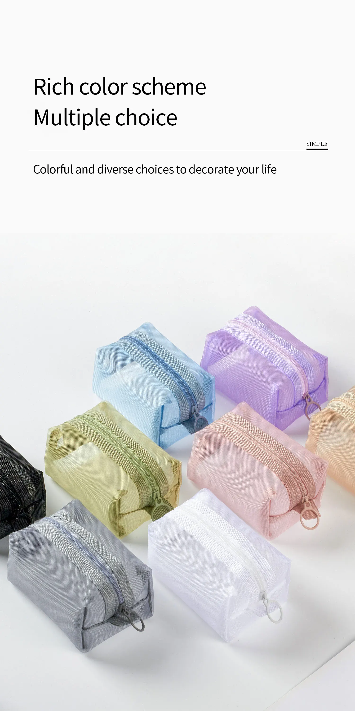 1. Mesh makeup bag, semi-transparent mesh storage bag, durable and stylish. Easy to wash and dry, not prone to wrinkling, lightweight, foldable, easy to carry.
