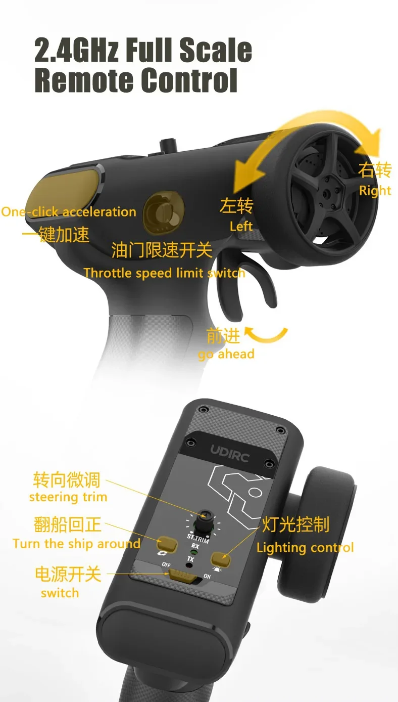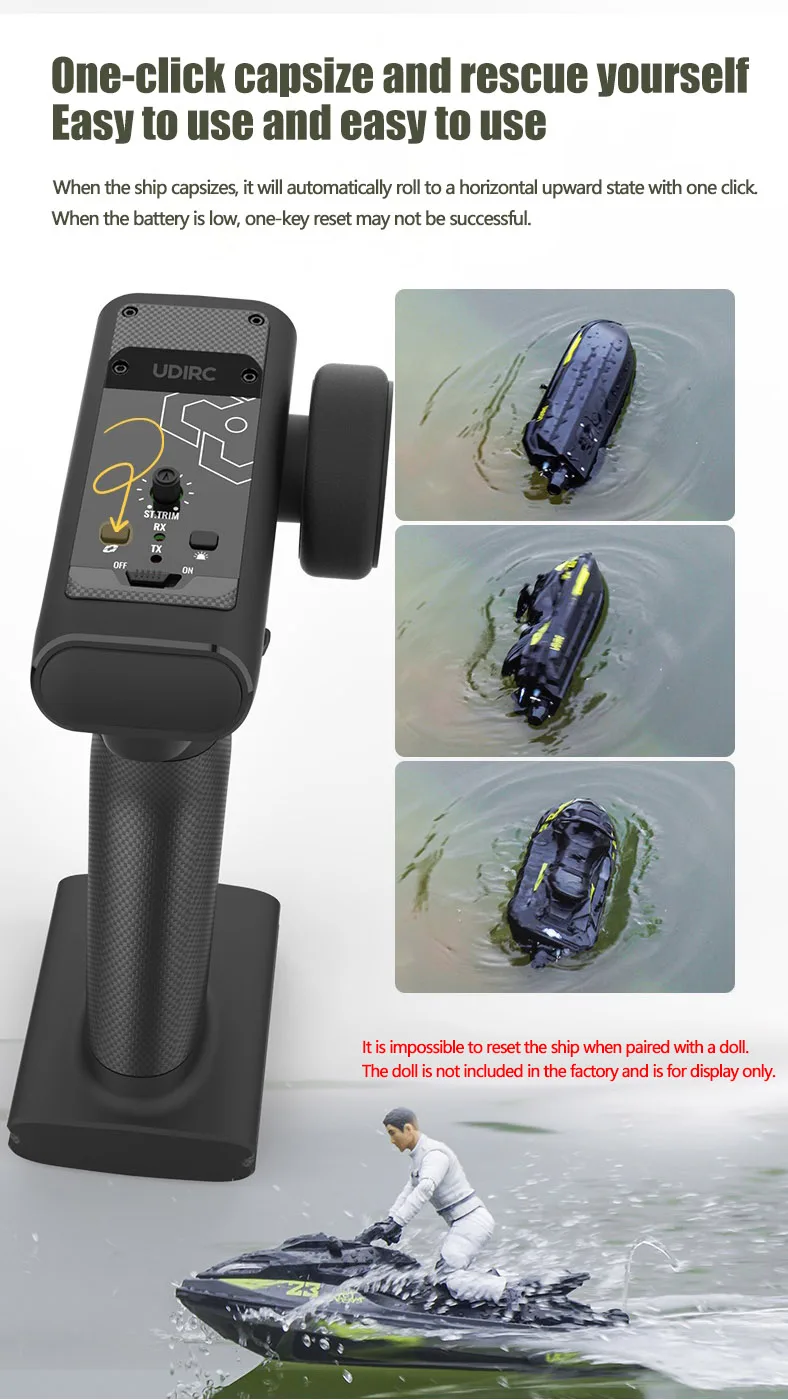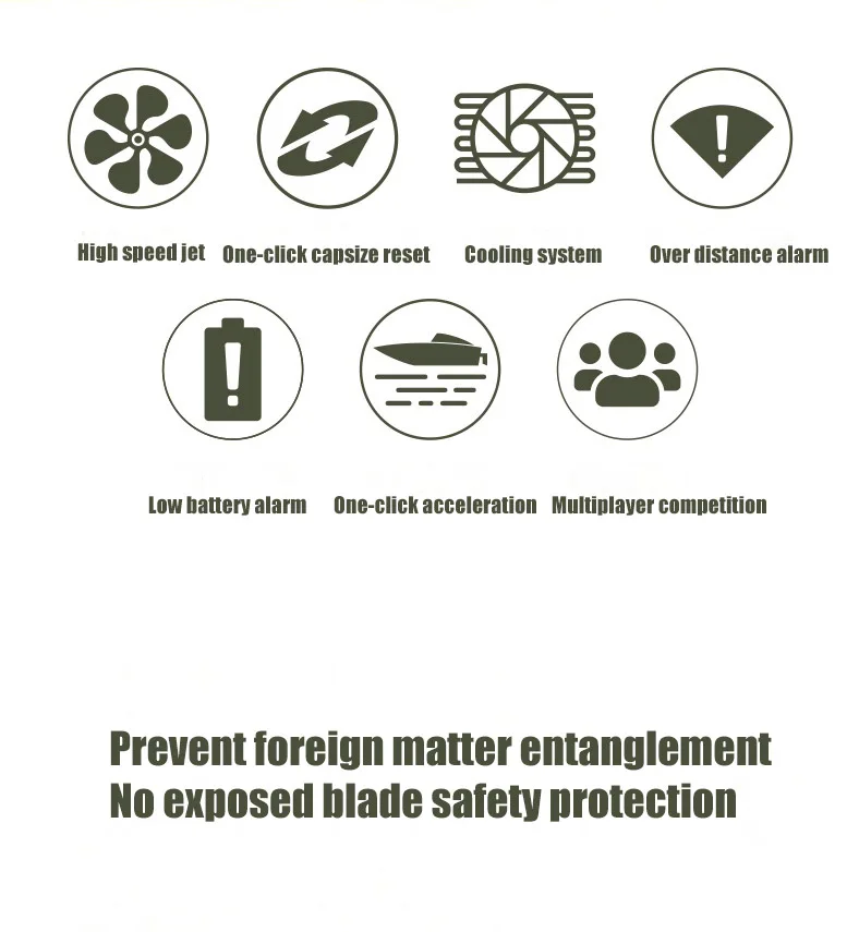 one-click return to normal after capsizing, water cooling system, low power alarm, over distance alarm, forward and backward, turn left/right.