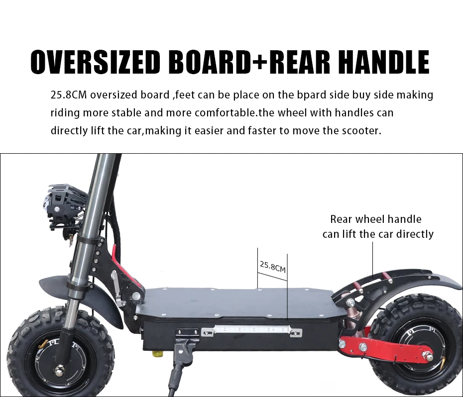 The electric scooter has 6000w powerful motor,it can help you ride faster in the road,no fear of going uphill free switching between single and double drives,ready to use.