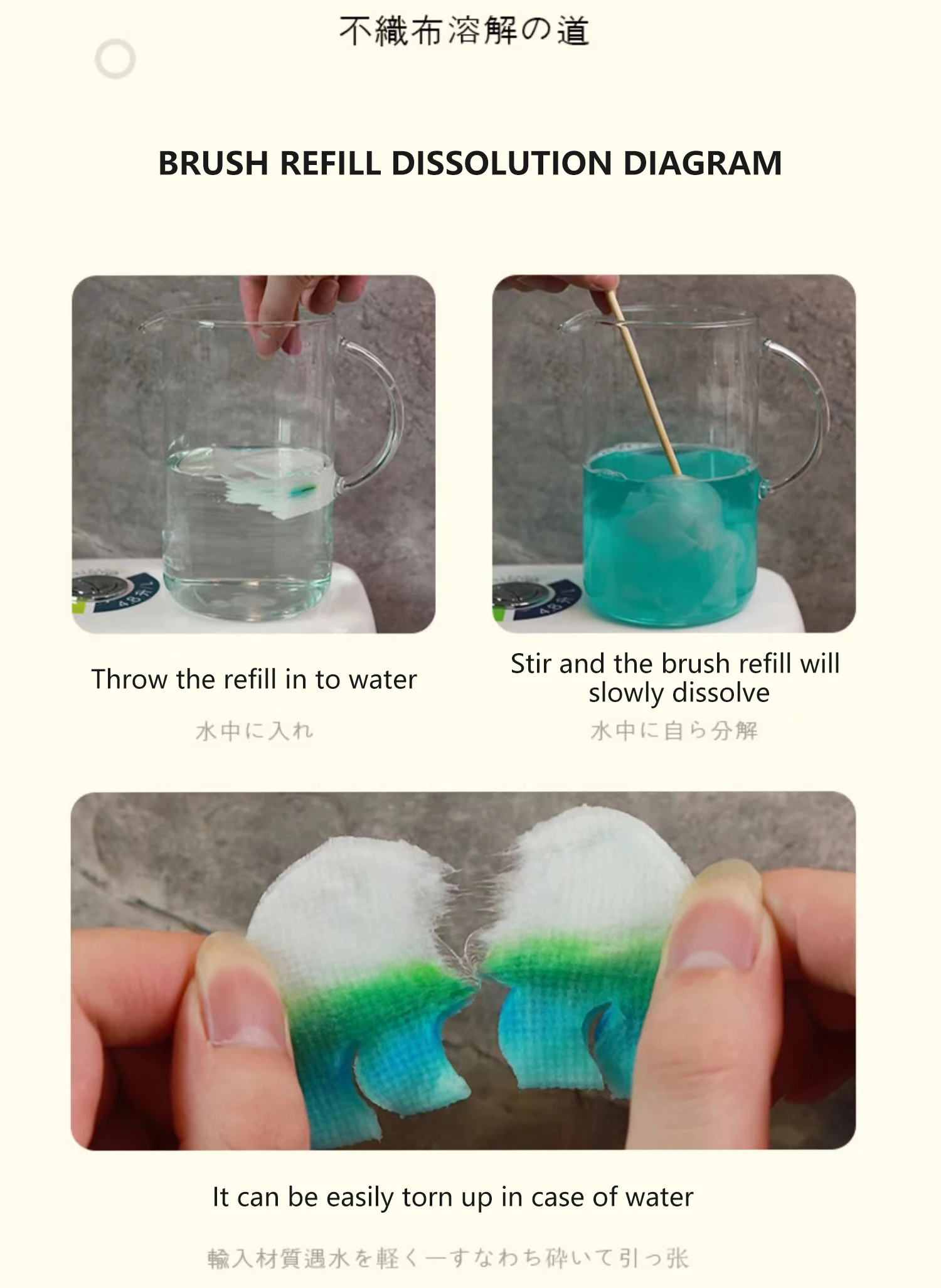 If a water solubility test is required, the brush refills needs to be quickly stirred in a beaker with water for about 8-10 minutes, and the brush refills will gradually dissolve. The main material of the refills are rayon+wood pulp,plant fiber, naturally degradable.