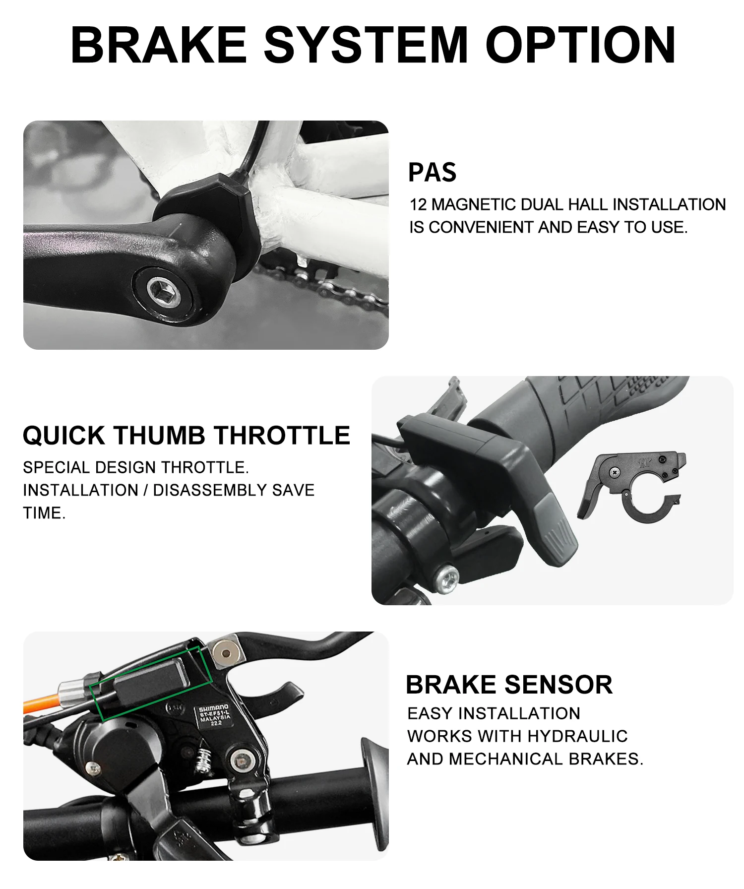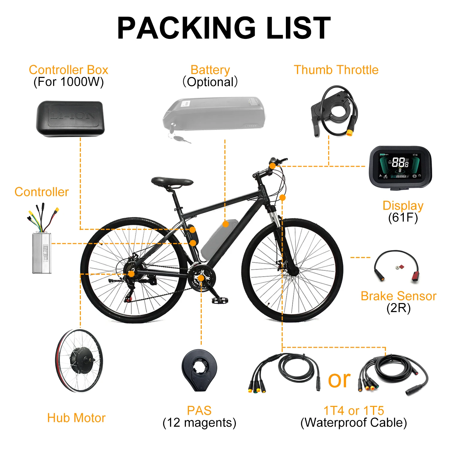 for installation: motor wheel, controller, display, thumb/twist throttle, brake sensor,