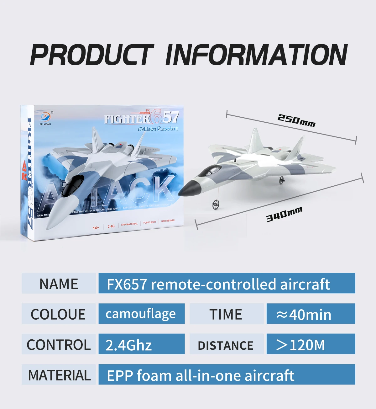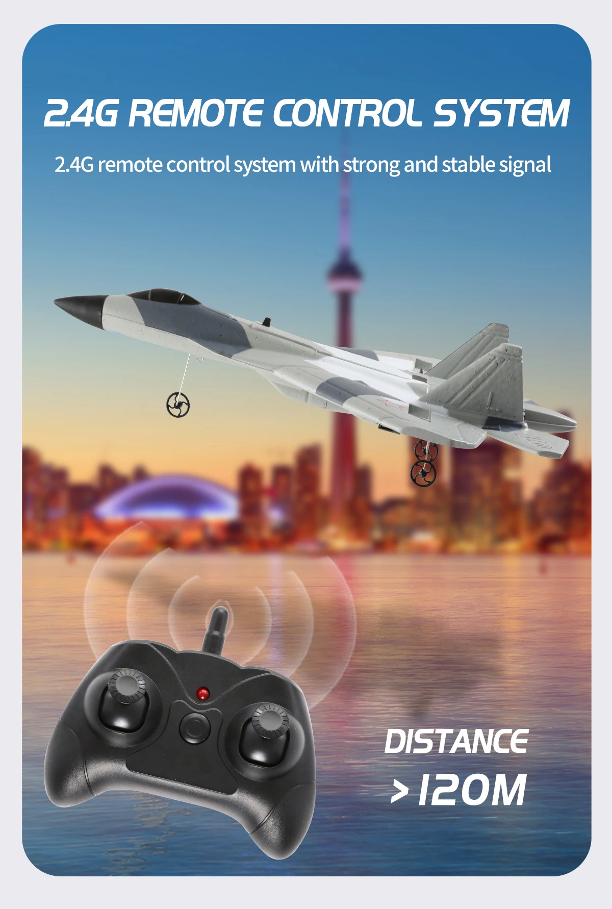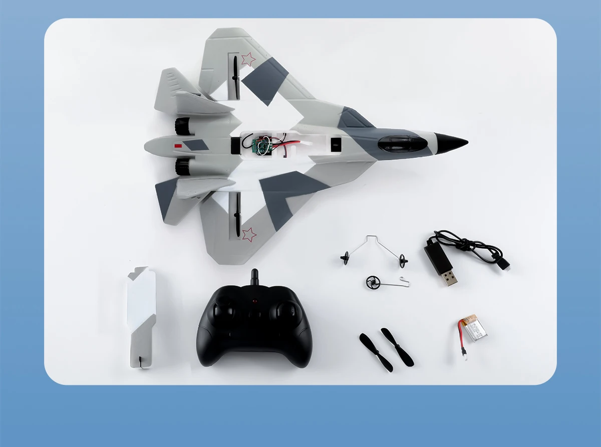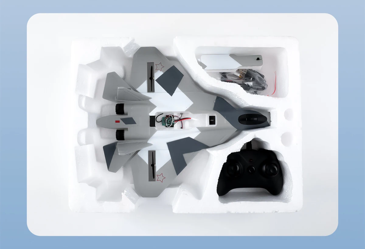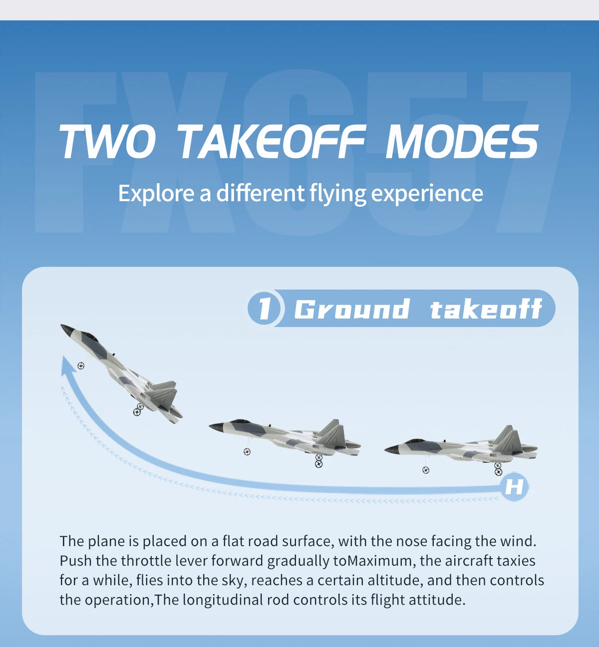 The plane is placed on a flat road surface, with the nose facing the wind.Push the throttle lever forward gradually to Maximum, the aircraft taxiesfor a while, flies into the sky, reaches a certain altitude, and then controlsthe operation,The longitudinal rod controls its flight attitude.2-Hand Thrown Takeoff
