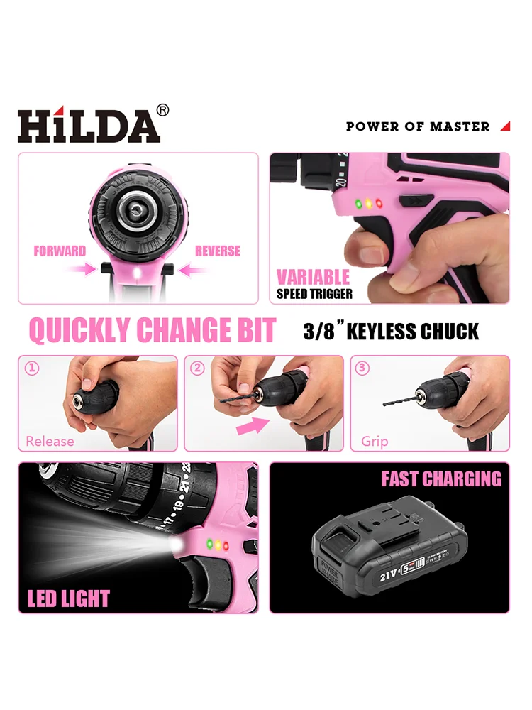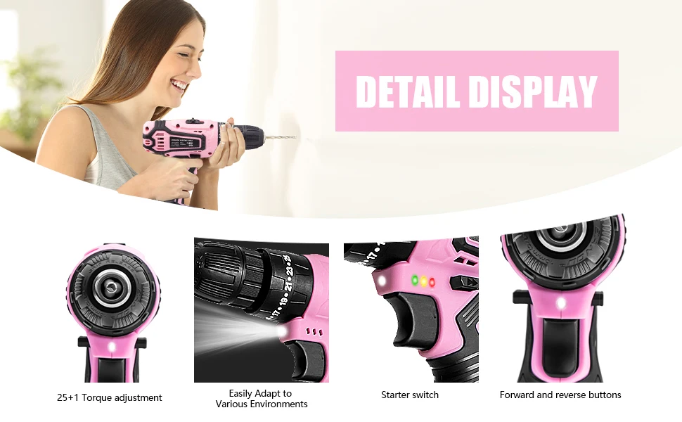 Discover that this multifunctional pink drill set is the ultimate companion for your family project. This set includes essential DIY tools. Put all items in the accompanying tool bag. Suitable for people who enjoy creating and repairing.