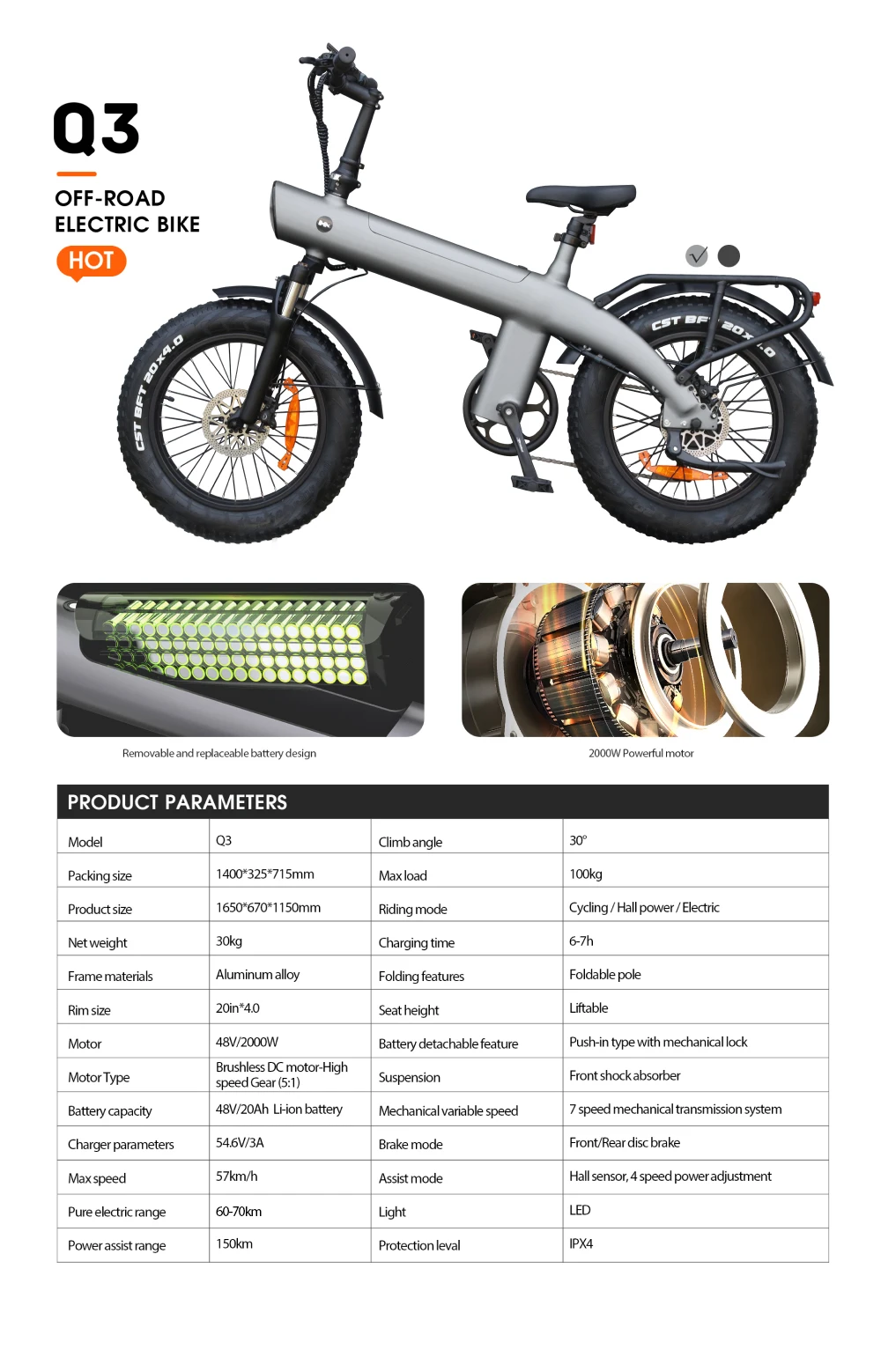 HX Q3 Mountain Electric bicycle 2000W Adult electric bike 48V 20AH Ebike 20Inch Tire Off-Road fatbike City e bike