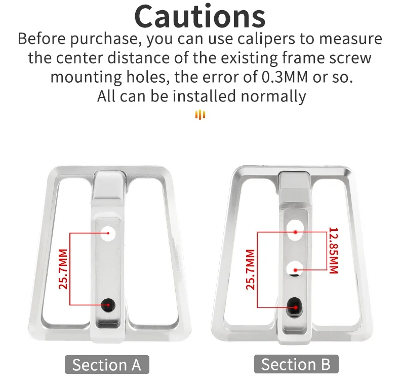 A mounting hole distance of 25.5 mm, B mounting hole distance of 12.85 and 25.7 mm, B will be suitable for more bikes, you can measure the hole distance of your base before ordering. General error of about 0.3mm can be installed and used normally.