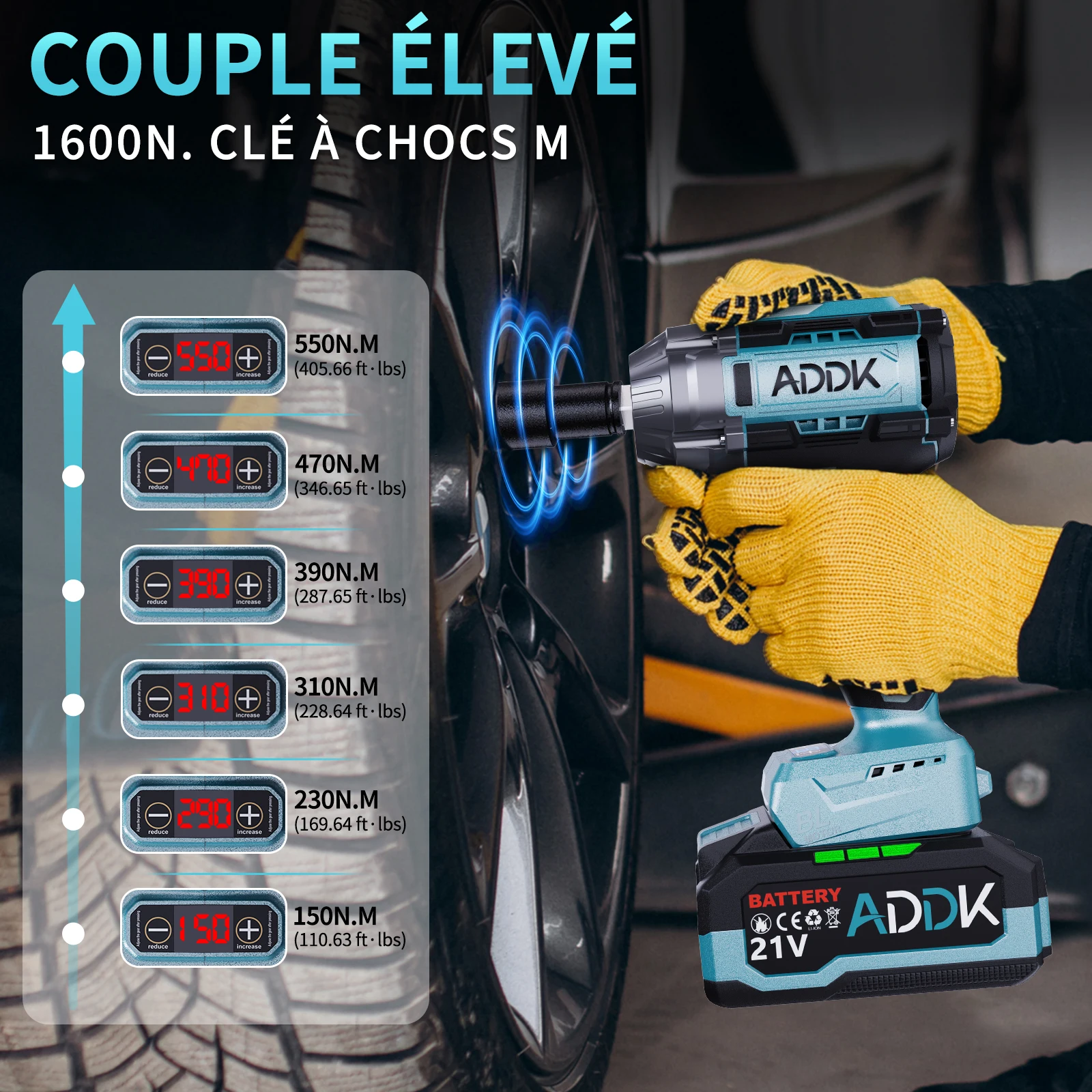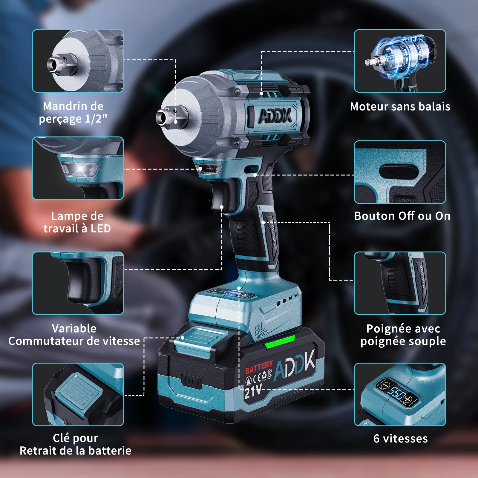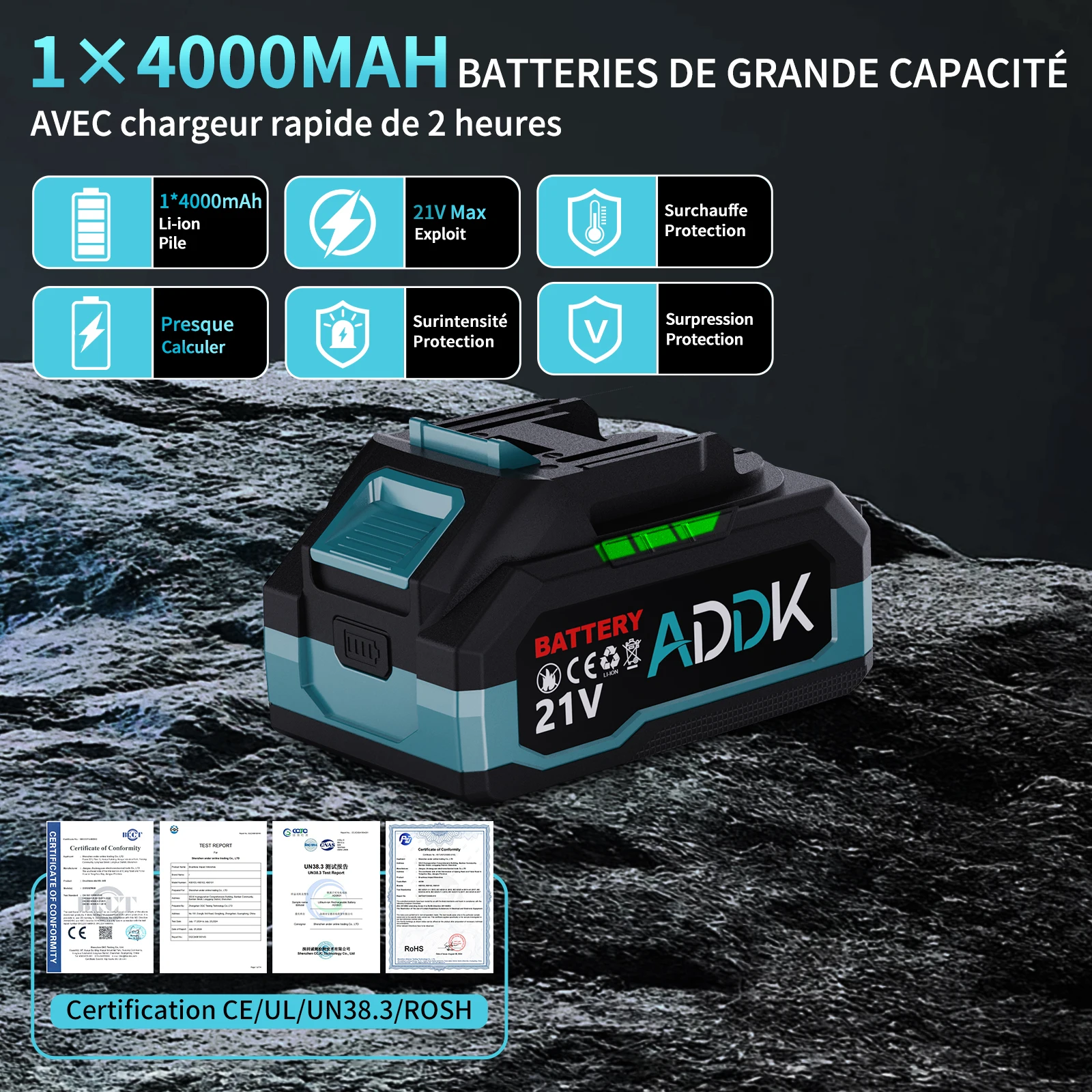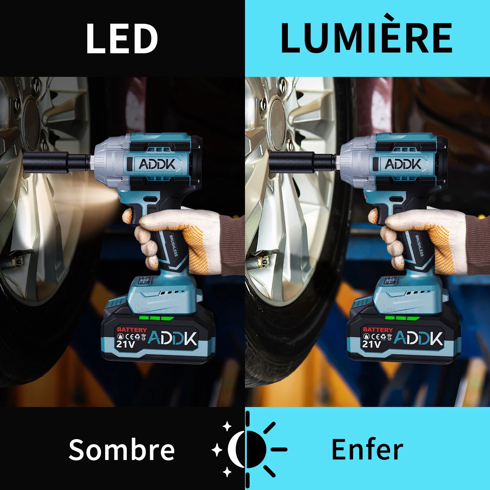 【Long-lasting Efficiency】: We know that battery life is of utmost importance to users. The ADDK cordless impact wrench comes with a new high-performance lithium battery that offers 30% longer runtime compared to standard 4.0Ah batteries. This means you can work for longer periods without worrying about battery life. An LED indicator shows the remaining power in real time, so you're always informed during use.
