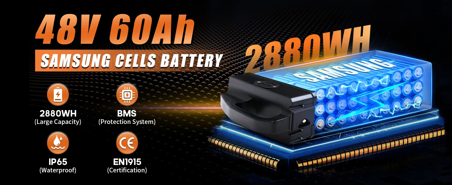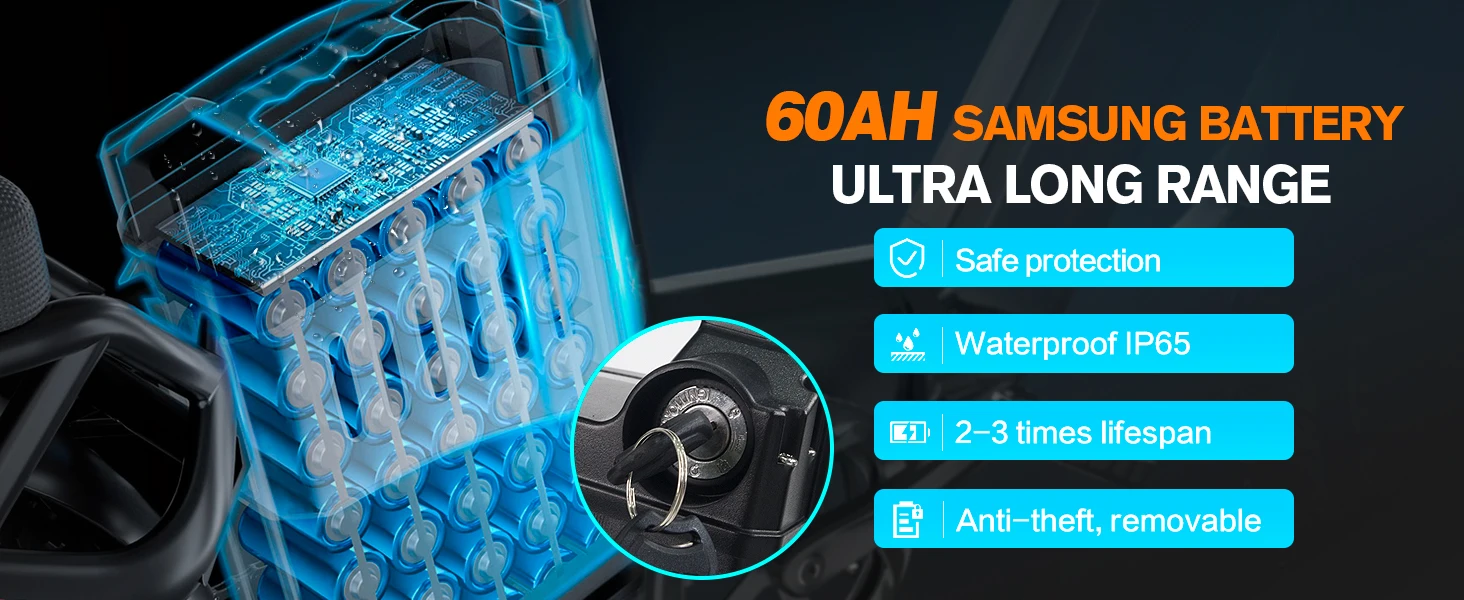 【40AH/60Ah Waterproof Long Range Ebike】Equipped with a robust 40Ah/60Ah battery, this adult electric bike lets you ride farther and longer, so you can leave range anxiety behind. Mileage depending on factors like riding mode, load, weather, and terrain. The waterproof, removable battery features a built-in lock for easy detachment and secure charging, offering superior protection against theft.